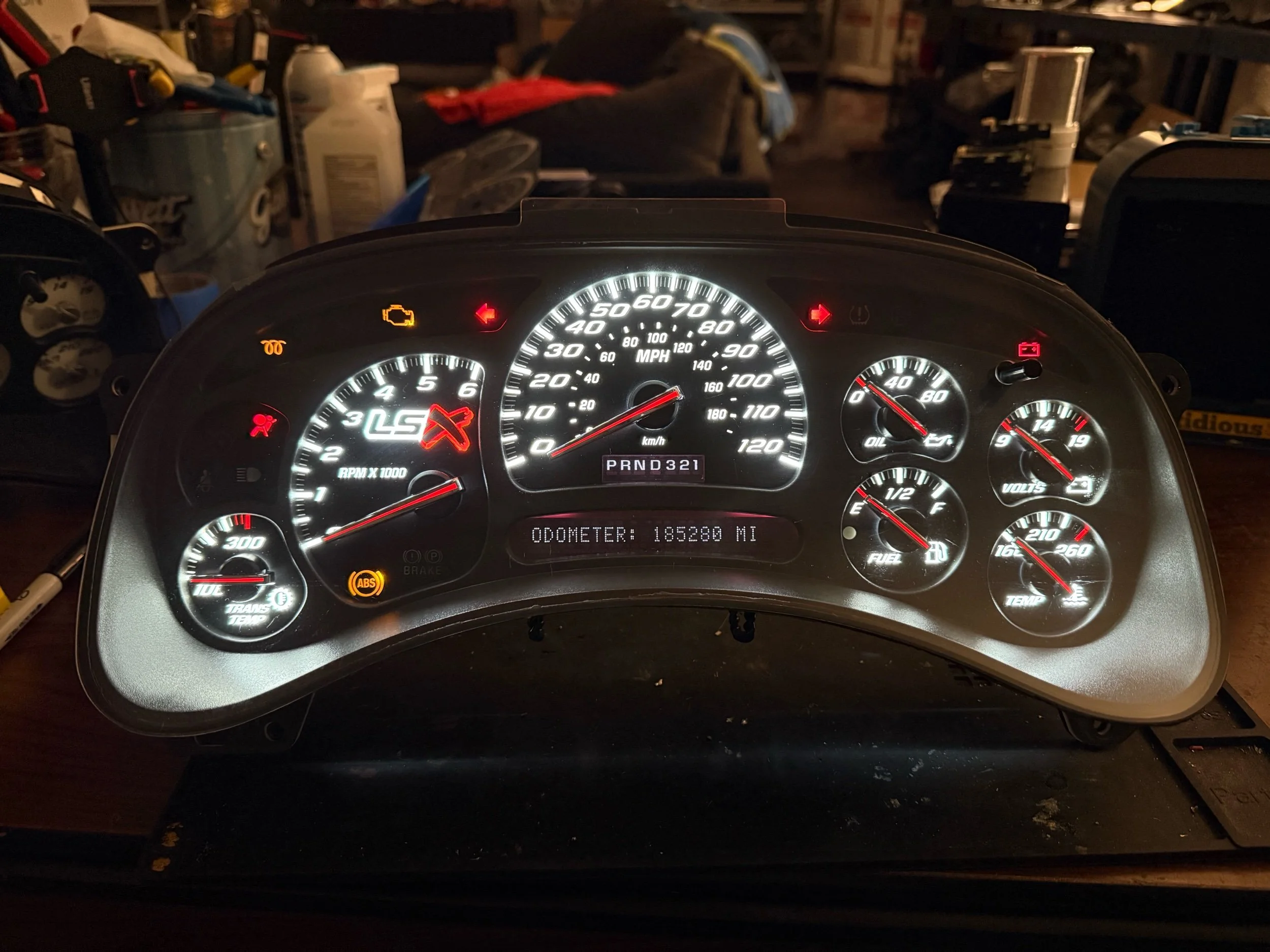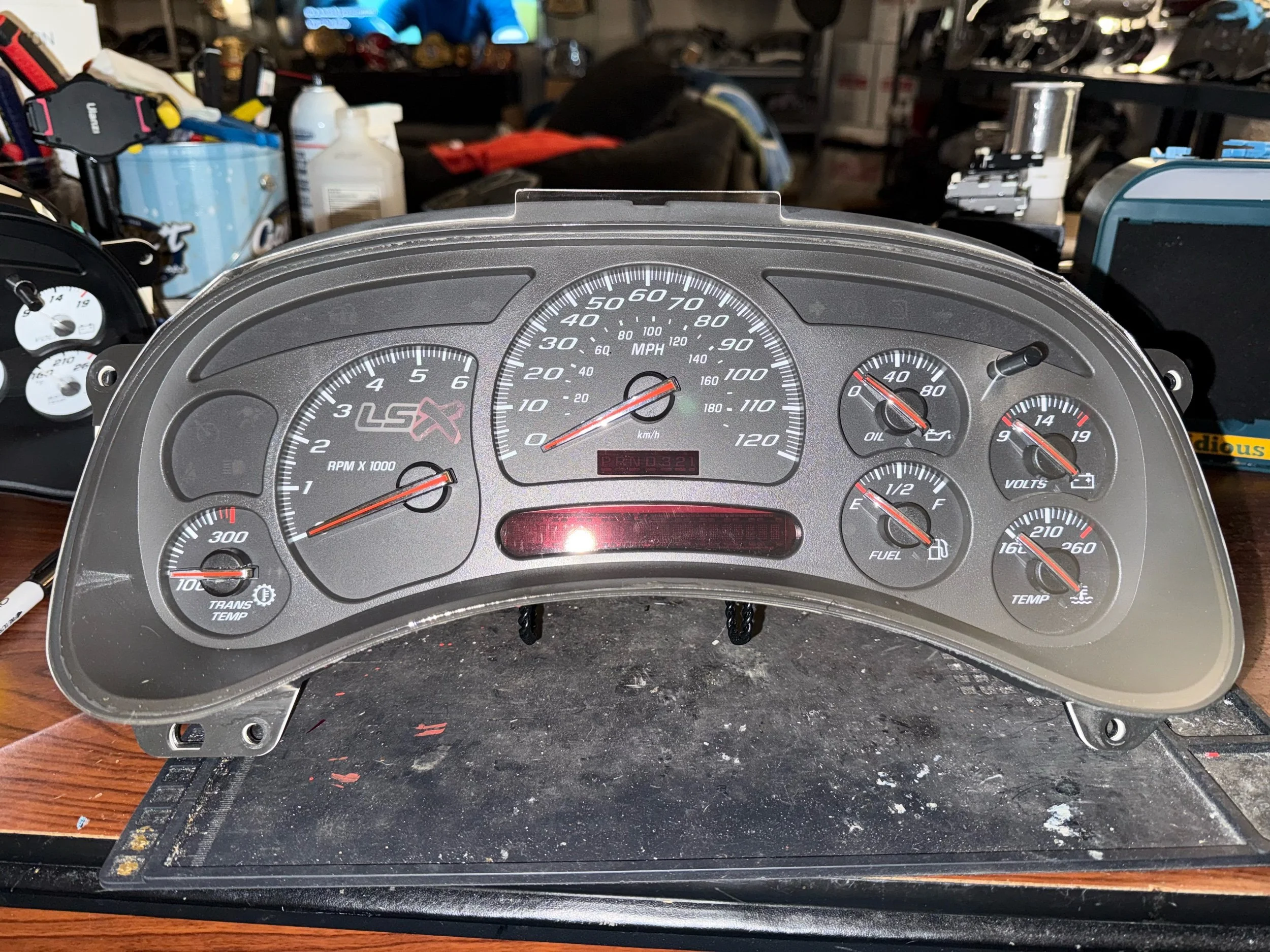 Fully Refurbished and Custom built with LEDs, engraved Overlay, Chrome Red needles, warning lights and Front Escalade cover bezel.